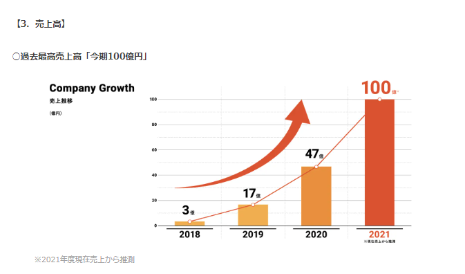 下記のグラフが示している通り、ナハトの売上高は毎年順調に右肩あがりの急成長を遂げており、創業初年度の3億円からわずか4年で約33倍の100億まで到達しています。